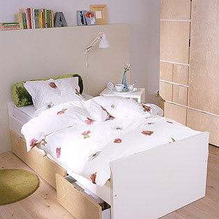 雖然看起來(lái)是張?jiān)俸?jiǎn)單不過(guò)的單人床,但是顏色的搭配和那么許多靠墊,都是女孩子愛(ài)它的原因??雌饋?lái)是不是很溫馨?。?