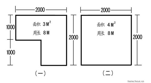 “L”型廚房用這種算法誤差特別大,舉個(gè)例子,看下圖,一個(gè)是“L”型廚房,一個(gè)是正方型廚房,外框周長(zhǎng)是一樣的,都是8米,可面積一個(gè)是3㎡,一個(gè)是4㎡,要是按銷售的算法,瓷磚用量要差四分之一,可實(shí)際上瓷磚用量是一樣的,這是因?yàn)閺N房墻面積的正確算法應(yīng)是:周長(zhǎng)乘以墻高,下圖種廚房面積差四分之一,而周長(zhǎng)是一樣的,所以用磚量也是一樣的(瓷磚計(jì)算圖二)。