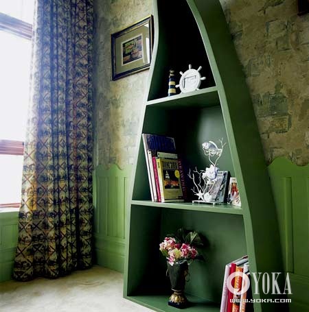 3 綠色的小床為特別訂制,獨特的船形能夠和背景墻很好的契合,同樣的木質(zhì)材料又如同是樹的延伸,從而成為房間的主體部分,營造出森林中的氛圍。