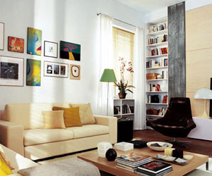 整個(gè)客廳沒有任何過(guò)于搶眼的顏色清新的米色、黃色、淡綠色在黑色單人坐椅和灰色木質(zhì)墻飾的點(diǎn)綴下更顯柔和電視機(jī)背后的墻面兩側(cè)裝有高達(dá)天花板的白色書架用于收納書籍,成為一面值得賞玩的背景墻,窗下空間也被充分利用,沙發(fā)背后的墻壁上,多幅收藏的裝飾畫在此集中展示,更是一種不著痕跡的收納妙法