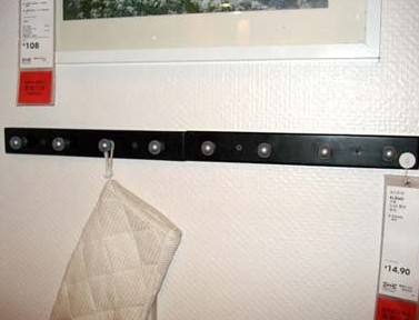 另一面墻上的掛桿,微波爐手套、圍裙等廚房用品就可以掛在這里,方便又整潔。