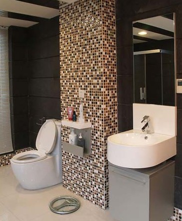 這是一個(gè)很小的衛(wèi)生間,加起來(lái)面積大約5平方米。整體以暗色調(diào)為主,為了保證干濕分離,淋浴間部分與其他部分之間加了一道鋼化玻璃幕墻,把功能區(qū)劃分得清清楚楚。