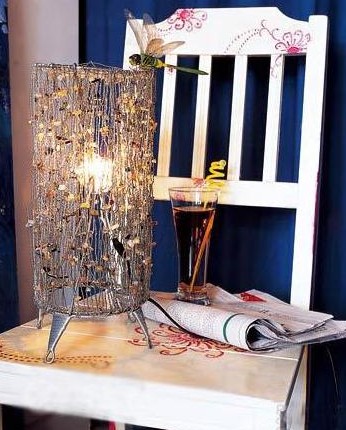 材料:細(xì)鐵絲(或鋁絲)、碎石、燈泡細(xì)鐵絲十分柔軟,很容易被擰成想要的形狀。上百根鐵絲麻花,穿上五彩碎石,就成了這款獨(dú)一無二的鐵絲燈。燈光灑在桌上和墻上,形成美麗的影子。做這樣的燈,一定要有足夠的耐心,享受擰麻花的樂趣。