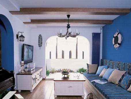 客廳里大量使用了藍(lán)色與白色,是地中海風(fēng)格中最常見最經(jīng)典的一種色彩組合,在讓人感到清爽、閑適的同時還擴大了視覺效果,有效解決了空間不夠大的問題。另外從其他一些建筑元素上,也注意突出主題,配飾和細(xì)節(jié)的處理上亦非常完美。不管整體還是局部,都浪漫而詩意