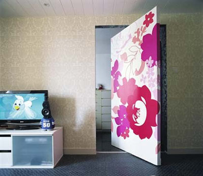 首先是那道神秘的大門,它的艷麗、獨特、趣味,讓我們不得不一再驚嘆楊賽文的創(chuàng)意。楊賽文說,這道大門的靈感來自于日本偵探漫畫中的一集:《密室案件》。一扇轉(zhuǎn)門,隱于墻中,輕推旋轉(zhuǎn),兩個世界。這道大門是連接臥室與客廳的重要環(huán)節(jié)。因為門的尺寸太大,而旋轉(zhuǎn)門又涉及太多復雜的物理原理,加之大門的旋轉(zhuǎn)轉(zhuǎn)軸,及用做固定大門用的隱形磁鐵安裝等等,都成了裝修時的棘手問題。