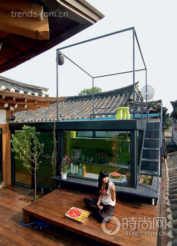建筑師Simone Carena與他的伙伴在2001年離開家鄉(xiāng)意大利,來到了韓國首爾,創(chuàng)建了自己的工作室。幾年后,他在首爾古老的三清洞街巷中擁有了一棟房子,這里既是兩個(gè)人的家,也是他們的工作室。在這里,兩種文化,兩種功能共同存在著,無論是建筑結(jié)構(gòu)還是空間色彩,或者是建筑材料和功能劃分,都具有鮮明的兩面性,它們營造的是強(qiáng)烈的視覺沖擊力,但又被巧妙地統(tǒng)一成一個(gè)和諧的整體。傳統(tǒng)的韓屋建筑雖被翻建一新,卻與街巷周邊的環(huán)境保持著和諧統(tǒng)一。