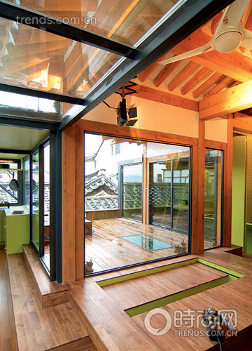 起居室內(nèi)保持了韓國傳統(tǒng)的臥地居住方式,地面的幾大塊凹槽和隔板就是他們的沙發(fā)和茶幾,同時(shí)也是用餐區(qū)域,這樣的設(shè)計(jì)大大節(jié)省了家具對(duì)于空間的占用浪費(fèi),同時(shí)也體現(xiàn)出了主人對(duì)于傳統(tǒng)生活方式的熱衷。起居室的后門一直通向庭院,這里的面積雖然不大,但是由于通過樓梯與天臺(tái)連接的方式,又一次有效地?cái)U(kuò)大了使用空間,使得這里成為家庭聚會(huì)最理想的場(chǎng)所。整個(gè)生活空間舒適而自由,延續(xù)了傳統(tǒng)的起居方式,同時(shí)也滿足了現(xiàn)代生活方式的需求。
