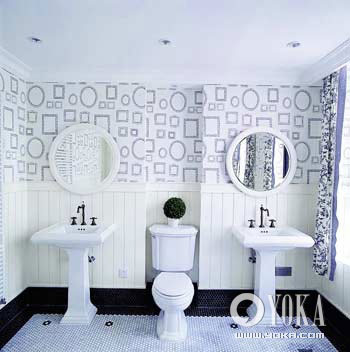 那是個(gè)抽水馬桶嗎?它難道不更像一個(gè)寶座嗎?不但馬桶本身居于嚴(yán)格對(duì)稱(chēng)的布局正中,就連唯一的植物都在強(qiáng)調(diào)著這個(gè)抽水馬桶的不可一世??瓷先?,這個(gè)衛(wèi)浴間更像是以這個(gè)馬桶為中心設(shè)計(jì)的。在馬桶周?chē)粌H強(qiáng)調(diào)格局的對(duì)稱(chēng),而且到處都是圓形和方塊。這兩種圖案鋪滿(mǎn)了墻壁,就連鏡子和盥洗池都是。再加上整齊排列的頂燈和墻圍上的大量的直線(xiàn)條,這個(gè)衛(wèi)浴間的主人是個(gè)有點(diǎn)自我中心的人,他重視自己的地位和權(quán)威,嚴(yán)謹(jǐn)而不散漫。