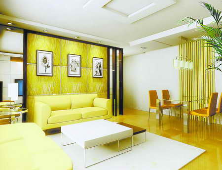本案主人崇尚質(zhì)樸、單純的生活方式,因此設(shè)計風格定位為簡約、自然、充滿濃濃的生活味。裝飾手法上不存在雕琢的痕跡,以塊面、線條等形式尋求視覺上的統(tǒng)一,在自然色系中體現(xiàn)高貴品質(zhì),讓質(zhì)樸、自然之風縈繞在空間的每個角落。明艷的黃色令空間彌漫了嬌嫩的色澤,配上皮革天然的質(zhì)感,使整體含蓄而儒雅。背景墻面上黑色的裝飾花紋讓輕柔中多了些華貴之氣,像滿壁的向日葵花在熱烈綻放,心情也隨之明快起來。素色的掛畫把房間裝飾得穩(wěn)重而小巧,又不失人文之氣。玻璃家具從材質(zhì)中折射出光線,加上臺燈的點綴,令空間更多了些層次和變化。白色與黃色在一起搭配讓人感覺年輕的光芒,乳白的茶幾、乳白的地毯,靜謐而雅致,激起主人無限遐想。