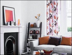 白色的墻面色彩清淡、簡(jiǎn)潔,對(duì)整體橙黃色調(diào)起到很好的中和作用,純木地板讓現(xiàn)代、輕盈的房間多了幾分厚重。白底橙、黑、灰三色花紋的窗簾在白色背景下顯得別有風(fēng)味?;野咨妓嚿嘲l(fā)搭配數(shù)個(gè)橙色和棕色靠墊,宜家的長(zhǎng)方小桌上是橙色石質(zhì)花瓶、灰缸形花瓶和船形果盤(pán),造型別致。壁爐架上畫(huà)框內(nèi)依然是橙色圖畫(huà),和香蕉形黃色花瓶。墻角的架子上隨意擺放著橙、白、青灰色花瓶和小相框、飾物等。整體空間雖然有大幅的白,但橙色始終都作為主色調(diào)存。