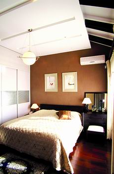 臥室:純?nèi)?、樸實的設(shè)計風格,低調(diào)色彩沉著穩(wěn)重,絲光暖棕色壁紙,平衡的k>線條貫穿整個空間。中式與現(xiàn)代吊燈的共融,讓整個空間沉浸在純樸的主題之中,沁透出自然的風情及深厚的文化底蘊,讓人感悟、領(lǐng)略著生活棲居之美。
