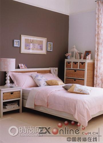 溫暖與美麗 床頭主墻面以穆哈咖啡色打底,構(gòu)成主基調(diào),墻面正中是白色長(zhǎng)方像框和兩個(gè)微型像框。緊鄰墻面則采用灰白色,層次分明,過(guò)度自然。Crucial Trading 的羊毛地毯依然是以灰白色呼應(yīng)主題。Elanbach 窗簾,Havana 床,床上鋪以粉色床罩和白色枕頭以及棕色、白色帶花紋小墊子,粉色作為整體布局中唯一的亮色,十分搶眼。床邊白色小桌和白色小柜,均帶藤制抽屜,小桌上Cath Kidston的臺(tái)燈白色支架和粉色燈罩,柜上飾以白色燈籠和數(shù)朵鮮花。