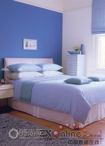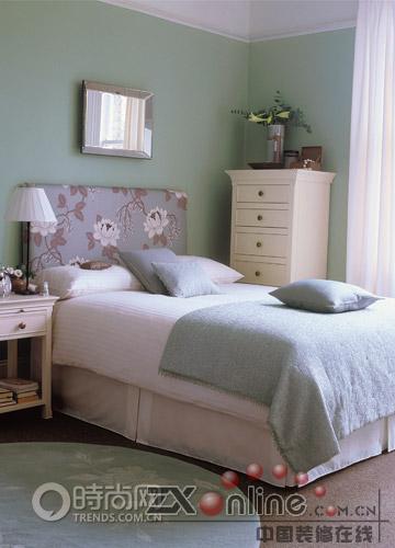 巧妙與鮮明 粉紅色的墻面定下整體基調(diào),給人以朦朧的浪漫感覺(jué)。Crucial Trading 的灰白色羊毛地毯,以及Harlequin 白色窗簾與粉紅色過(guò)度十分自然。白色的床邊小桌和柜子仍然帶藤制抽屜,桌上放有藍(lán)色托盤(pán)和藍(lán)色臺(tái)燈,是整體色調(diào)中活潑的一筆,柜子上飾以小圓鏡、藍(lán)色花瓶和小花枝。灰白色的床上覆以Laura Ashley 粉紅色的床罩,白色床單、白色枕頭、藍(lán)、粉色小靠墊,溫暖而舒適。