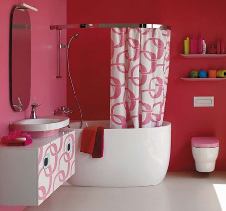 由粉紅色和白色構(gòu)成的圖案是女孩的最愛。也可以選擇這種圖案的防水壁紙來提升浴室的可愛度,甚至可以把各種卡通造型的皂盒、浴液瓶統(tǒng)統(tǒng)擺放在臺面上。但浴室柜則不要選擇顏色過于沉重的,白色的剛剛好。