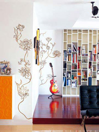 簡約風(fēng)格的家中,往往蘊(yùn)涵著一語道破的驚喜,如同一個(gè)不顯山露水的人,卻可能擁有耐人尋味的人格魅力。二者另一個(gè)共同點(diǎn)在于,都需要我們?nèi)グl(fā)現(xiàn)和探尋。進(jìn)門正對著的墻壁,是給來者第一眼的印象,起初不敢畫,因?yàn)檫@個(gè)位置太重要,太顯眼。丙烯、金漆,出來后的效果令人滿意,于是它們繼續(xù)“攀爬”到客廳的墻面上。