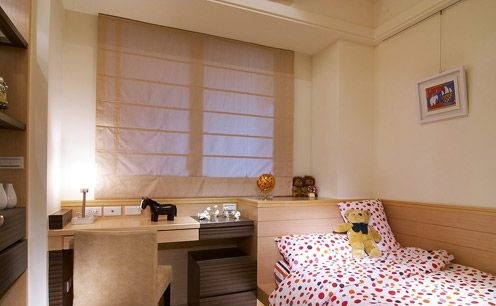 還在讀幼兒園的小女孩的房間利用線條顏色勾勒出小女生活潑的感覺,用曲線圓形來突顯兒童的趣味性,窗戶的設(shè)計(jì)也以弧度的轉(zhuǎn)角來修飾。