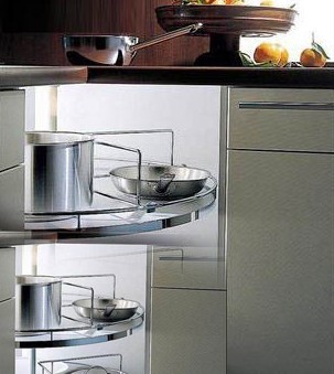 有些廚房的工作臺(tái)、櫥柜在設(shè)計(jì)時(shí)有一些轉(zhuǎn)角,其實(shí)這也是一個(gè)很好的利用空間,大有文章可做。旋轉(zhuǎn)式網(wǎng)架是最富有創(chuàng)意、最科學(xué)的設(shè)計(jì),他通常是利用櫥柜的死角,可以讓你充分利用有限的空間??梢栽谵D(zhuǎn)角櫥柜中安裝一個(gè)旋轉(zhuǎn)式網(wǎng)架,放置鍋具。使用時(shí)只需輕輕一轉(zhuǎn),就可以拿到需要的物品,十分簡(jiǎn)單方便。