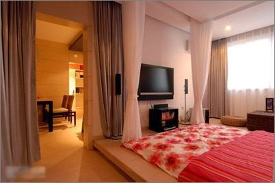 在擺放床的地域處,裝修出10公分左右高 的木質(zhì)“地臺(tái)”,相應(yīng)地選用較低矮的床。其效果是:使睡眠區(qū)的環(huán)境更為清潔;地臺(tái)烘托中的床與人更有一種“精品”的藝術(shù)美感;尤其是花梨木質(zhì)的地臺(tái)還可給人以芬芳的氣息。