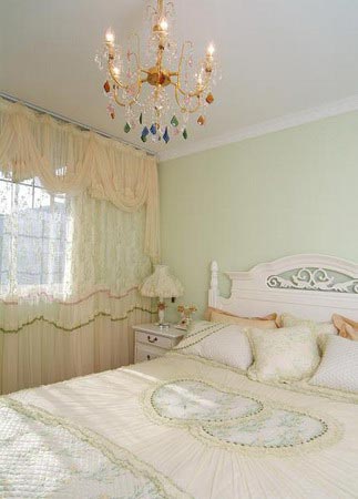 七、窗簾“二線”法。臥室中既然以床為中心了,其它飾物一般就應有“退居二線”的襯托意識。如窗簾,面積較大,太艷、太豪華了,就會與床飾形成兩 個“中心”,以至讓人眼花繚亂。故窗簾應選用相應一點兒的色彩、圖案、面料, 像一個“仆人”站在床邊。