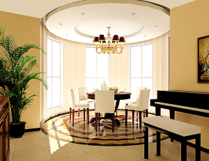 需要注意的是,吊頂不是獨(dú)立的,一定要和房間整體相呼應(yīng)。一般而言,方正的吊頂下方最好也對(duì)應(yīng)方正的家居擺設(shè),圓形的吊頂下方則可對(duì)應(yīng)圓形或橢圓形的餐桌。在色彩選擇方面,最保守同時(shí)也是最好的方法就是吊頂選擇白色。如果空間的四面和頂面都是彩色,人會(huì)有被封閉在一個(gè)盒子里的感覺(jué)。