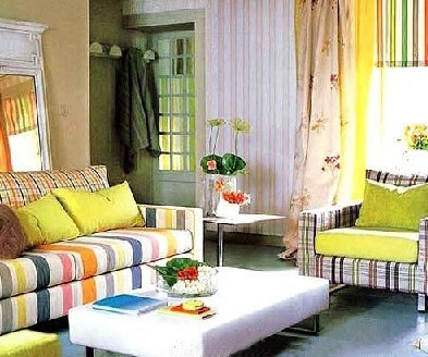 線條搭配花草、格紋等圖案的家飾布料,在混搭中取得異中求同的協(xié)調(diào)性。單純的顏色線條,局部墻面使用,便可把空間中所有不同的元素框在一起,壁紙本身即成為空間里不顯眼的、簡單的背景色。