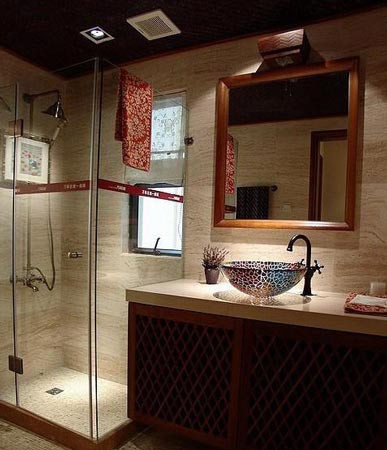 這款衛(wèi)生間設(shè)計(jì)非常大膽,本來是想做半敞開式,后來經(jīng)過修改,將馬桶單獨(dú)隔了一起來,將洗手臺(tái)放在外面,類似公共場(chǎng)合。由于相連的空間是游戲室,還擺放了一張麻將臺(tái)子、為了整理美觀考慮,在這間加了一道從頂而下的簾子,絲毫沒有突兀的感覺。