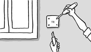 在處理電燈開關與插座周邊位置時,先關掉電源,以正常方式貼平壁紙,覆蓋過這些地方,然后再將蓋過開關與插座部位的壁紙自中央向四個角落切開。接著松開螺絲,以切開部位的紙緣折入蓋內(nèi),再裁掉多余的部分即可。