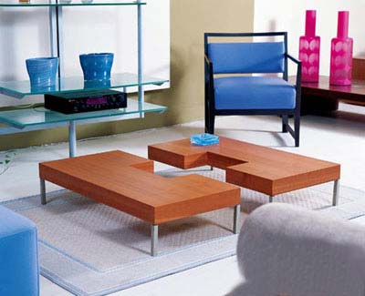 該款組合茶幾為櫻桃木材質,尺寸是100cm×100cm×50cm。簡潔金屬支腿使它顯得形體輕便,主人可以根據(jù)沙發(fā)座次的調整,隨意組拼形狀。