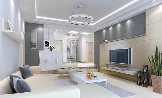 一個(gè)很大的客廳,凈高在3.5米左右。設(shè)計(jì)師為它設(shè)計(jì)了一個(gè)復(fù)雜的吊頂,吊頂中心呈圓形,周圍的厚度按逆時(shí)針方向增加,使平面的天花板呈現(xiàn)出立體感。
