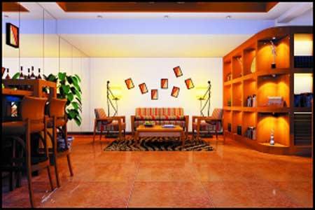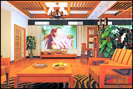 客廳與休閑室之間的墻中間被掏了一個(gè)方形洞,洞四周用木框包邊,做成窗戶的樣子。而客廳的電視機(jī)就放在窗戶上,給人的感覺(jué)是一面電視墻。在這個(gè)大窗框后面就是休閑室的墻,建議墻上用大幅山水畫或油畫,在室內(nèi)營(yíng)造一幅藝術(shù)美景。裝飾裝修