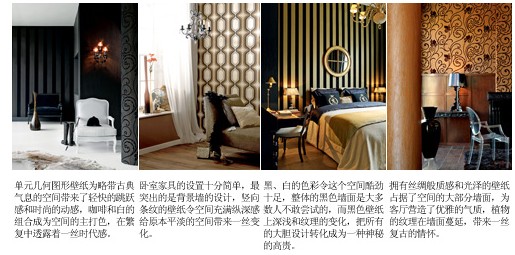 整體效果:壁紙的色彩十分廣泛,不同材質(zhì)的壁紙可以產(chǎn)生不同的色彩氛圍和質(zhì)感,紙基壁紙和PVC壁紙比較普遍,色彩眾多,容易清潔;而織物壁紙和植物壁紙?jiān)诹Ⅲw感的塑造上比紙基壁紙要略勝一籌,但是清潔起來比較麻煩,凹凸紋理的細(xì)節(jié)需要在保養(yǎng)上下一番工夫;其它的壁紙,如金屬壁紙、熒光壁紙可以產(chǎn)生一些特殊的效果來裝點(diǎn)房間。和絢麗色彩相映成趣的當(dāng)然是壁紙上的圖案,最常見的使用方法是在整體氛圍確定后,以局部點(diǎn)綴一些帶有花紋的裝飾圖案,把人的視覺重點(diǎn)自然地過渡到帶有圖案的墻面上,令鮮亮的色彩和各種圖案完美地融合在一起。
