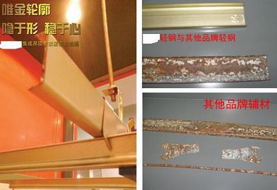 再來有個也很重要的,就是隱藏在扣板上面的龍骨 。龍骨從木質龍骨發(fā)展到普通鋼材的,到現(xiàn)在一線品牌集成吊頂所使用的加厚鍍鋅金屬烤漆的龍骨,(一般品牌的集成吊頂都不會主動介紹這個部分,另外有的品牌對這個部分直接送,大家這個時候就要主動看樣品了,然后和一線品牌的龍骨進行對比)