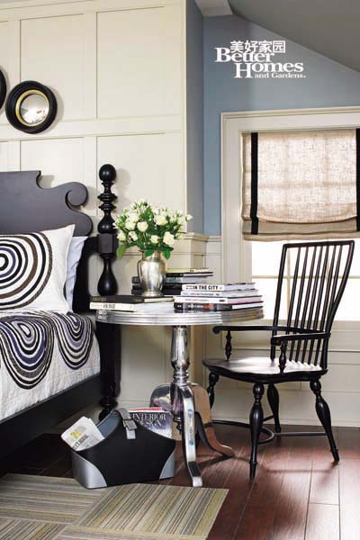 色彩:樸素的灰藍(lán)色和黑白色搭配,讓這個(gè)臥室顯得平和寧靜,為居室增添清涼感的同時(shí)卻絲毫不顯單調(diào),藍(lán)色的背景性使用柔化了居室格調(diào),為炎熱的夏季降溫。