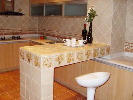 可以不用腰線,用花磚來營造下廚氣氛廚房可以選擇一套花式瓷磚,點綴平淡的墻面,為主婦下廚平添愉悅、活潑的氣氛。在選擇花磚時,更重要的是要有瓷磚“裝飾”的理念。一般來說,花磚主要起的作用就是增添效果,烘托氣氛,一個廚房可以選個兩至三片花磚就可以了,如果太多了就會顯得很累贅,眼花繚亂、雜亂無章的感覺。花色上主要以圖案鮮艷、活潑的能很好的突出廚房的氣氛的為主。而腰線,廚房我個人建議可以不考慮使用,主要是:一來由于櫥柜的地柜和吊柜之間的空間較小,一般也就75cm左右,如果加上腰線就會感覺有些累贅,二來可以減少不必要的開支。