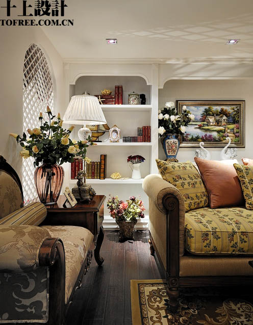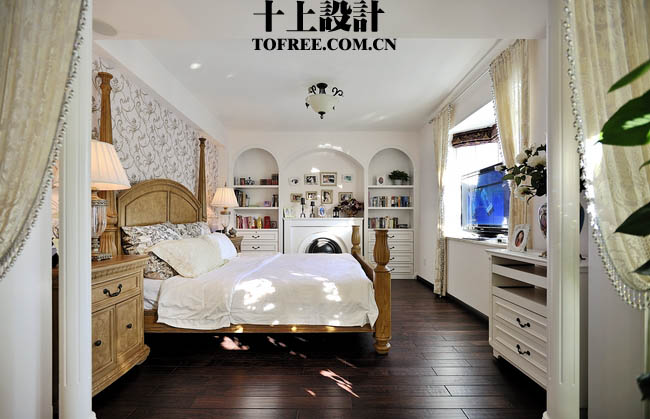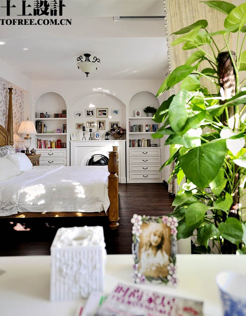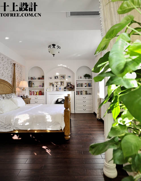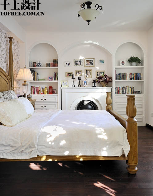 現(xiàn)在換一個(gè)角度看主臥,呵呵,盡頭也是一個(gè)裝飾柜,所不同的是中間造型做了一個(gè)壁爐,冬天取暖很舒服的