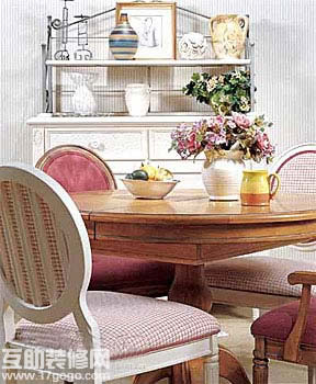 由于不少家庭出于戶型的考慮,并未特地開辟家居餐廳,但卻可以稍費心思在客廳的某個位置標新立異,于是一個特殊的就餐環(huán)境便能在客廳的范圍內(nèi)“渾然天成”。白色櫥柜因為鐵藝擱架的設(shè)計變得有些與眾不同,上面可以擺放些物品,集收納、展示于一體。而原木色餐桌與方格布藝餐椅椅墊相互搭配,形成悠閑清爽的地中海風(fēng)格。就餐的心情便像地中海的微風(fēng)迎面吹來般享受愜意。