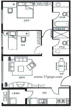 主衛(wèi) 有座便和潔身器及雙面盆來組成,便于夫妻雙方共同使用,浴缸處在臺階上,可采用軟性隔斷來區(qū)分干濕區(qū)。