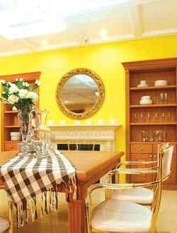 新鮮色彩需要細(xì)節(jié)點(diǎn)亮 紅葉桉木餐廳家具典雅而不滯重,透明珍珠白餐椅面輕松明快,刷成明黃色的背景墻既明麗可人,又不露鋒芒;古典掛墻鏡略帶洛可可風(fēng)格,華麗而神秘……這個(gè)餐廳空間看不到一絲慵懶和沉悶,一束白玫瑰不經(jīng)意地點(diǎn)綴其中,整個(gè)空間跳躍著的滿是春的鼓點(diǎn)。