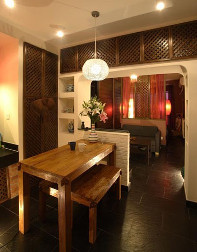 由于使用面積小,在設(shè)計上很是花了一翻功夫。在與業(yè)主充分溝通交流后,空間布局如何安排,雙方思路達(dá)成統(tǒng)一,真正行動起來,還是非常愉快的。打掉原進(jìn)入戶門的一道門連窗及窗下的墻體,并利用窗旁的部分承重墻和上面的混凝土梁,做成了一道弧型啞口,使餐廳與起居室保持通透的同時,增加了餐廳采光和整體空間的通透性。是不是很出采?