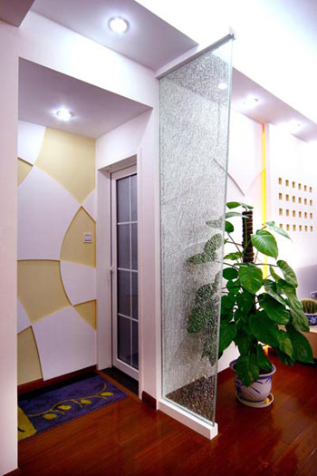 玄關(guān)一般與廳相連,由于功能不同,需調(diào)度裝飾手段加以分割,或吊頂、墻面、地面的形狀、色彩、材質(zhì)不同;或用門套、掛落、隔斷、屏風(fēng)、櫥柜相隔。在平面關(guān)系上,玄關(guān)與廳應(yīng)當(dāng)連而不直達(dá)、隔而不斷。