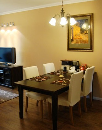 餐廳的墻面材料以內(nèi)墻乳膠漆較為普遍,一般應(yīng)選擇偏暖的色調(diào),如米白色,象牙白等。為了整體風(fēng)格的虛實(shí)協(xié)調(diào),餐廳需要一個(gè)較為風(fēng)格化的墻面作為亮點(diǎn),這面墻可以重新描繪一下,采用一些特殊的材質(zhì)來(lái)處理,如肌理效果,通過(guò)對(duì)其款式的選擇,可以烘托出不同格調(diào)的氛圍,也有助于設(shè)計(jì)風(fēng)格的表達(dá)。