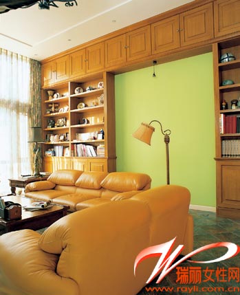 2 占據(jù)整面墻的落地柜是實木質(zhì)地的,自然的木色、黃色的沙發(fā)與淡雅的青草綠色搭配在一起,顯得非常諧調(diào),在落地柜的中間預留了掛畫的位置,這里將成為以后客廳的視覺中心。 上海裝潢網(wǎng)