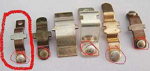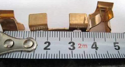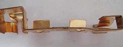 老式的鉚接銅片(明顯的可以看出兩頭材料跟中橋材料完全不一樣,而且有明顯的鉚接點)。一次成型永遠比老式的鉚接銅片好,因為一次成型的銅片永遠比鉚接的電阻小,相對發(fā)熱量也越小,彈性更好,安全系數越高,導電性越高)它的道理跟家里裝修房子線管里的電線是一樣的,一根完整的電線跟打結電線的區(qū)別。