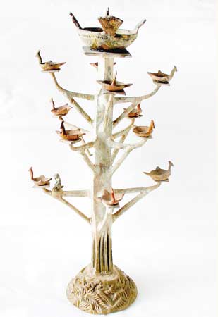 藏家任虎成珍藏有一件漢代釉陶“百花燈”,通高76厘米。燈由座、柱、臺和盞組成。底座直徑20厘米,施綠釉,樸實厚重。座面塑有環(huán)繞的山巒,間有神態(tài)各異的人物及虎、狼、鹿等動物。座上立有方形燈柱,立柱的釉面已泛銀,柱上有等距的三層十字布局燈架,每層有四個方形燈臺,燈臺上各置一黃褐釉、引頸、展翅、高4.5厘米的朱雀圓形燈盞。在第一層左邊朱雀燈盞旁還塑有一高5厘米、憨厚可愛的小猴,寓意民間廣為流傳的“猴子點燈”的故事。漢代工匠為了增強(qiáng)十字燈架的強(qiáng)度,制作時又從燈柱上伸出曲枝,予以支撐。燈柱頂端方形平臺上置一高9.5厘米、施綠釉、引頸、展翅、翹尾開屏狀的朱雀圓形燈盞。該燈具共計有十三盞,為漢代燈具中的多枝燈,亦稱“百花燈”。十三盞朱雀燈全部點燃后,滿室生輝,充滿神奇意味。這種豪華燈具,在當(dāng)時必定是達(dá)官貴人才能擁有的。