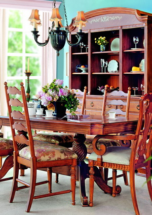 優(yōu)雅沉穩(wěn)的造型、清淡描花的色彩使它有一種法式風(fēng)情,帶著神秘而浪漫的氣息??梢詫⑹釆y鏡獨(dú)立于梳妝臺(tái)懸掛,也可以斜倚在妝臺(tái)面上,緊挨著的三個(gè)小抽屜可以存放一些常用的化妝品、小首飾等心愛之物,實(shí)用而漂亮。 上海裝潢網(wǎng)