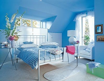 藍色清涼寧靜的氣氛令人感覺撫慰與放松,通過深淺不同的藍色參差的對比,以及格子與花朵圖案的微妙搭配,使臥室單純而不單調(diào),帶著海一般的夢幻感覺。