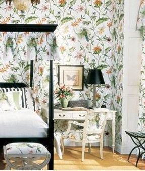 紛繁富麗的墻布令人感覺仿佛走進野花遍地的樹林,林中蕭蕭的樹葉聲中傳來清幽的鳥鳴,黑胡桃木的床好象就擺在樹林中,白色的床罩和黑白條紋的靠枕簡潔而理性,與漂亮的墻布形成鮮明而生動的對比。