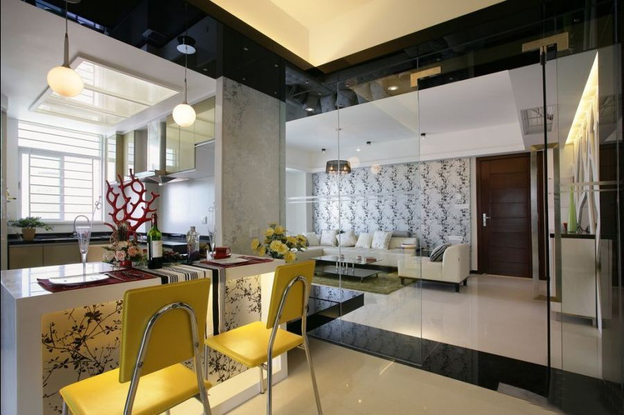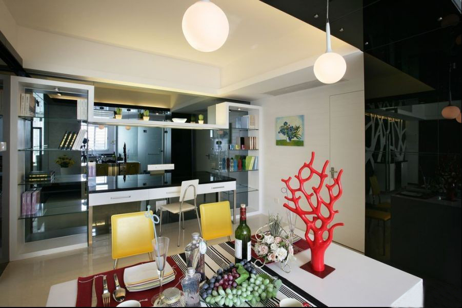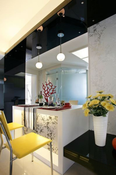 在餐廳,看似吧臺(tái)的餐桌配上黃白雙色的餐椅,亮麗的黃色為整個(gè)空間增多。