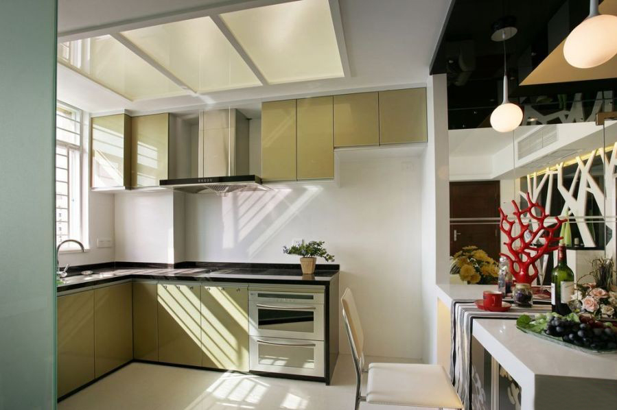 休息與工作,時(shí)間與空間,可更大限度地互補(bǔ)互換,以獲得更大的彈性和自由度,將不同的功能融合在一個(gè)有不明顯界限的空間內(nèi)。廚房間也可以如此舒服。半開放式的廚房以餐桌相隔。