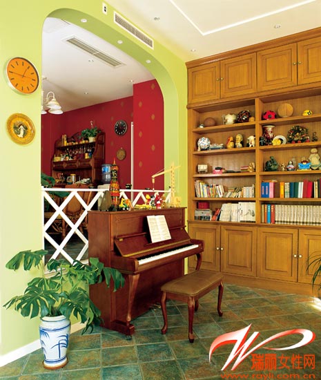 1 客廳和餐廳用青草綠色、紅色兩種不同的顏**分開(kāi)來(lái),交界處是一個(gè)拱形造型,把兩個(gè)空間諧調(diào)地連接在一起,中間放了一架木質(zhì)鋼琴,上面擺滿(mǎn)了各式各樣的小飾品。 上海裝潢網(wǎng)